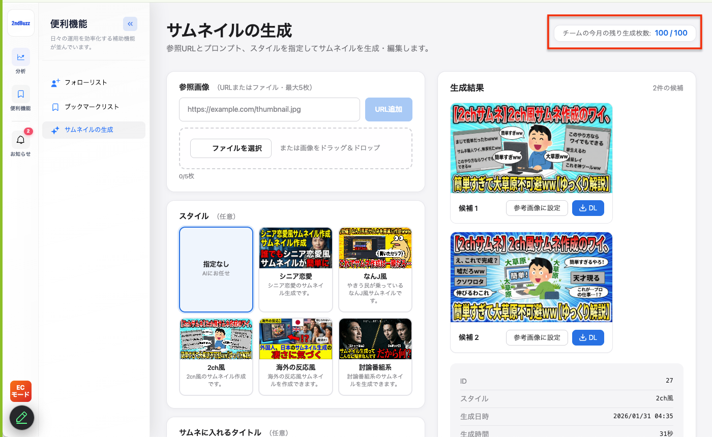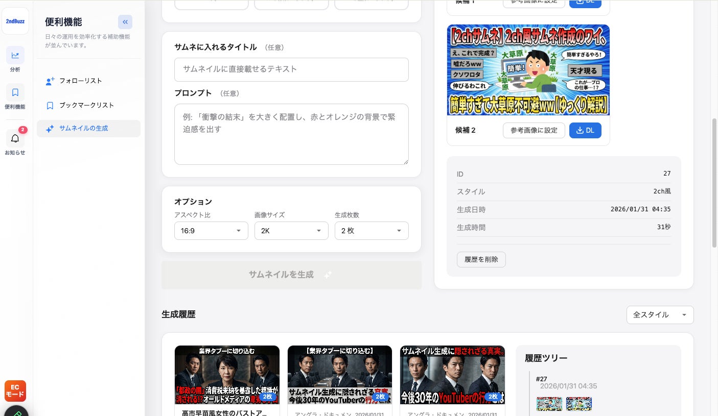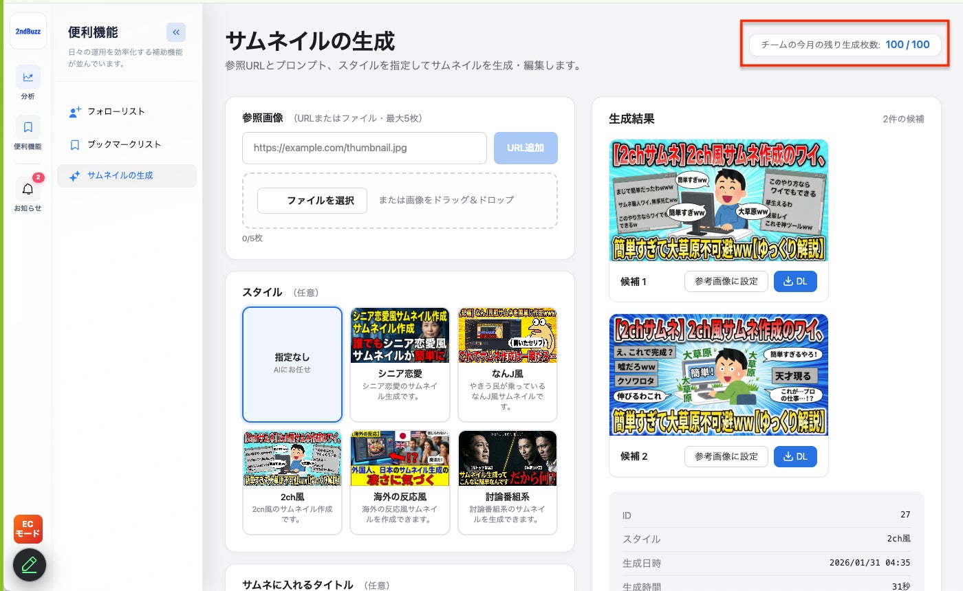株式会社KASHIKA(本社:東京都大田区、代表取締役:小澤健太)は、YouTube・TikTok分析ツール「2ndBuzz」において、新たにAIによるサムネイル自動生成機能を追加しました。