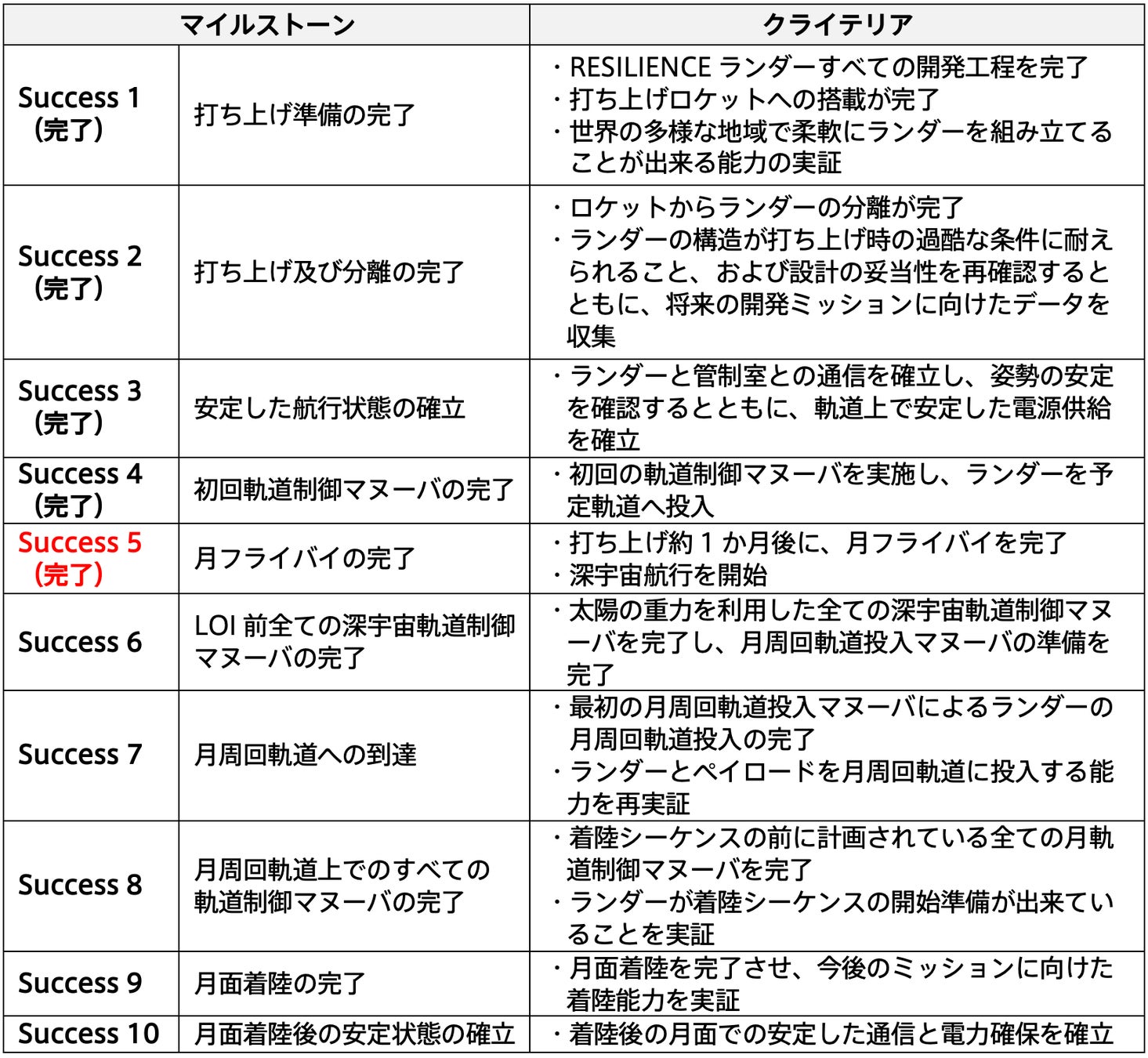 ispaceは打ち上げから月面着陸まで、10段階のマイルストーンを設定しました。各マイルストーンには基準を設け、達成を目指します。基準に基づき評価された結果は、後続する開発中のミッションに適宜フィードバックされます。なお、各マイルストーン達成の進捗状況等は適時に公開を予定しております。