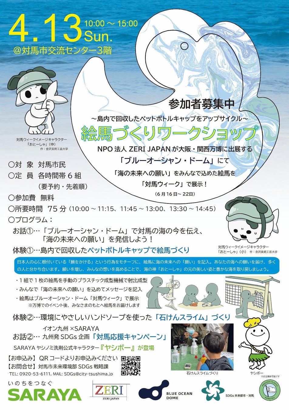 本イベントは、対馬市、SARAYA株式会社、NPO法人ZERI JAPAN、Precious Plastic唐津(NPO法人唐津Farm&Food)が協力して行うもので、対馬島内で集められたペットボトルキャップをアップサイクルして絵馬を制作します。絵馬のデザインは、金沢美術工芸大学が担当し、対馬の自然や文化、海洋環境の保護をテーマにした特別な作品が完成予定です。