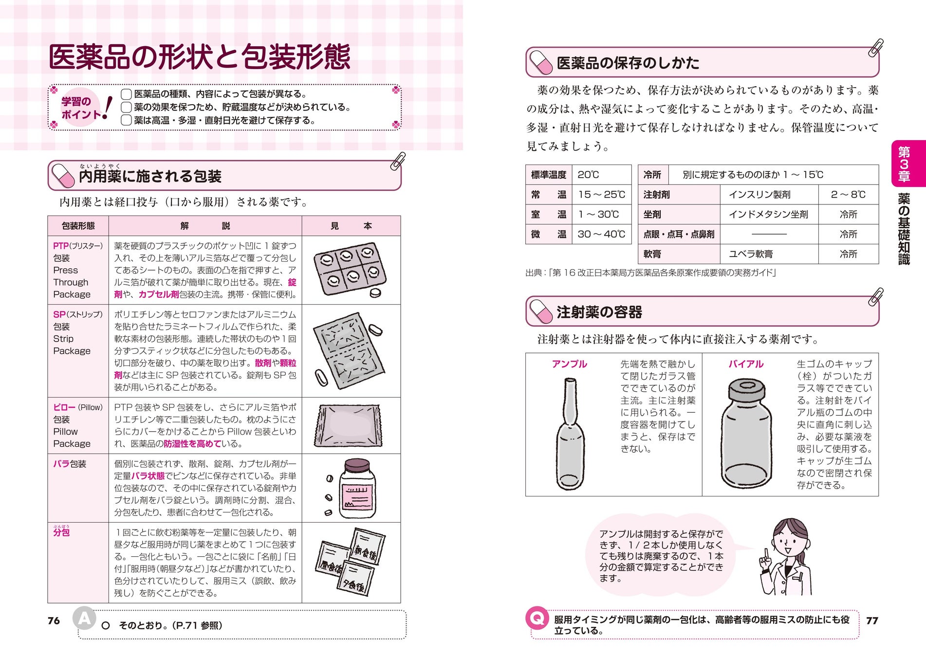 医療保険の種類、薬の販売業の種類、医薬品の分類と形状、処方箋の基礎知識、調剤報酬の算定のしかた、レセプトの作成手順をイラストと表で図解しています。