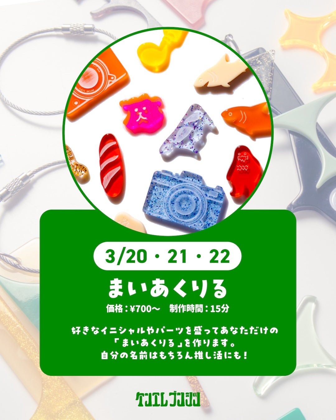 好きなイニシャルやパーツを自由に盛り付け、自分だけのアクリルチャームを制作できる体験型ワークショップで、事前予約不要でご参加いただけます。