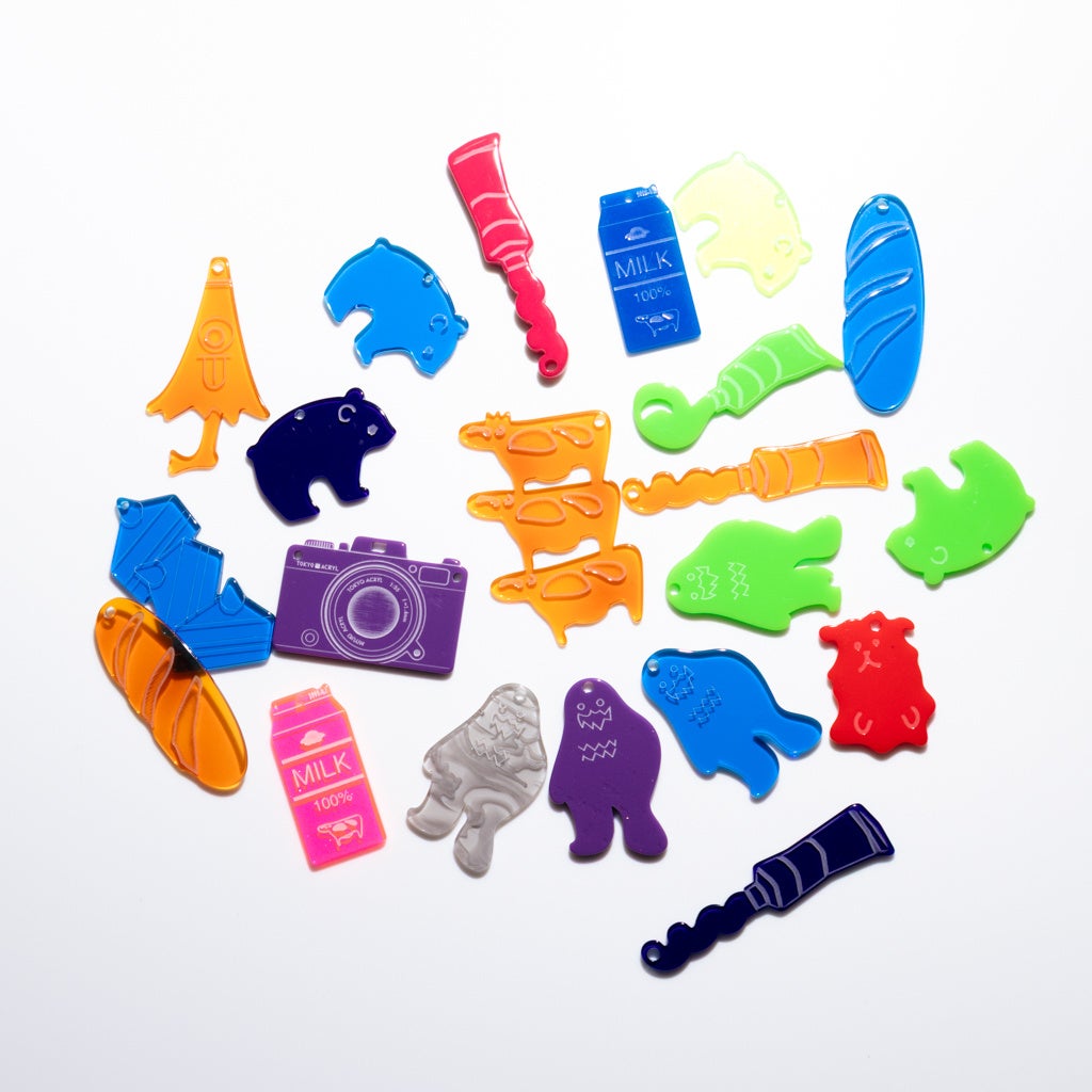 今回のポップアップでは、“ごちゃ盛りキーホルダー”と呼ばれるオリジナルキーホルダーを販売します。カット済みのアクリル端材の中からお好みのパーツを選び、自分だけの組み合わせでキーホルダーを作ることができる人気企画です。