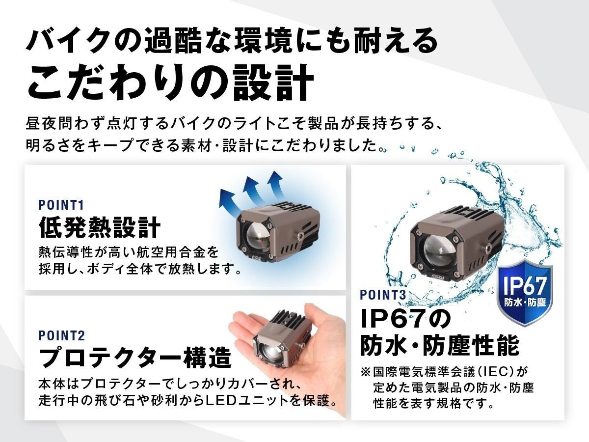 また、対向車への眩しさを抑える正確な配光設計を施したプロジェクターレンズを採用。走行中の飛び石からレンズを守る堅牢なプロテクター構造や、放熱性に優れた航空用アルミ素材の採用など、過酷な走行環境下でも長く安心してご使用いただける「誠実なモノづくり」を体現しています。