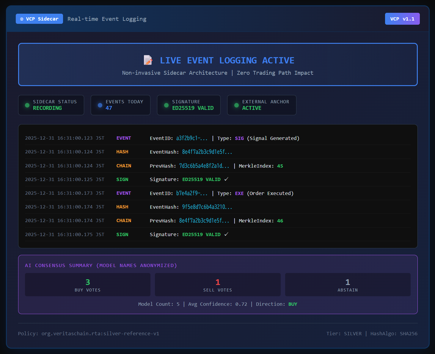 VCP v1.1は、VCP v1.0との後方互換性を維持しながら、アルゴリズム取引およびAI駆動型取引システムにおける外部検証性と監査完全性を大幅に強化したプロトコルアップデートです。