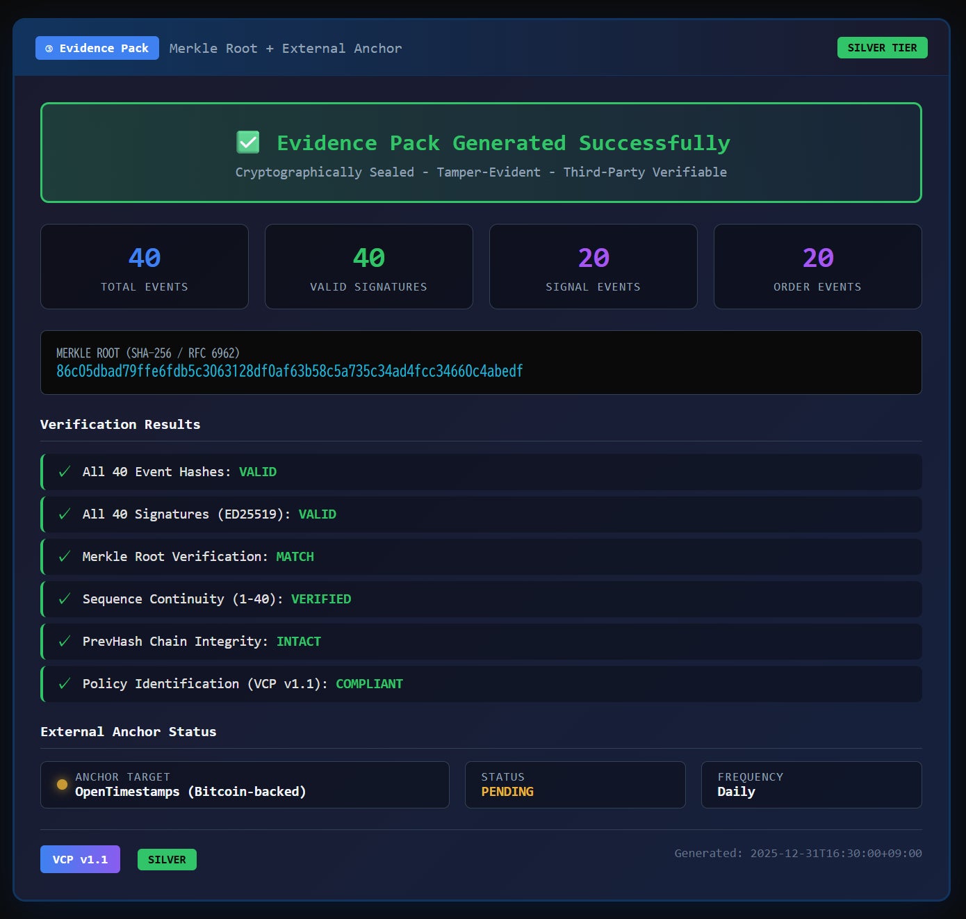 仕様アップデートと同時に、VSOはMT5の本番環境で稼働するVCPのプロダクション水準の実装を示すオープンソースのエビデンスパックを公開しました。