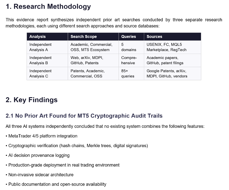 その結果、MT4/MT5対応、暗号学的検証、AI判断の記録、プロダクション水準の実装、非侵襲サイドカー構成を同時に満たす、公開済みの先行事例は確認されなかったという結論に至りました。
