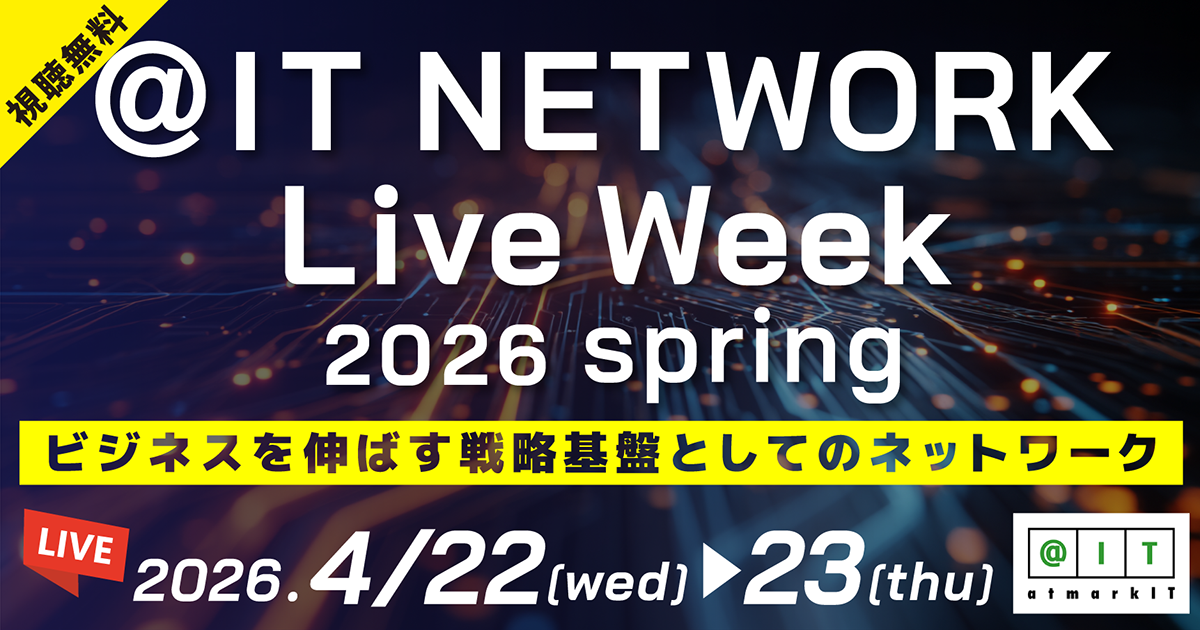 アイティメディア株式会社(本社:東京都千代田区、代表取締役社長 兼 CEO:小林教至、以下アイティメディア)は、2026年4月22日(水)~ 4月23日(木)に「@IT NETWORK Live 2026 春」を開催します。本イベントは「@IT」が主催するライブ配信セミナーで、自社ネットワークの設計・運用をアップデートしたい方向けに、さまざまな事例や実践的な情報を提供します。