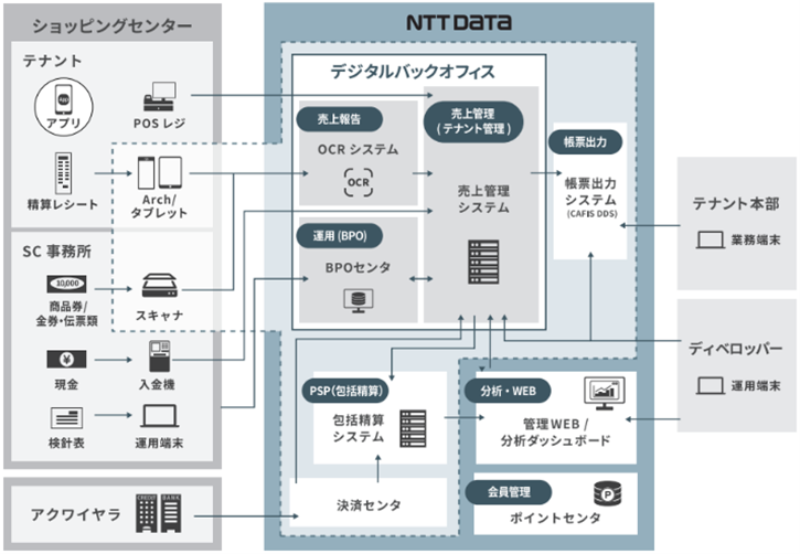 NTTデータの「デジタルバックオフィス」は、売上管理業務をワンストップでサポートするサービスとして、会員管理システムや決済サービスと共にショッピングセンターに導入されています。本サービスにおいて、NTTデータの開発したアプリケーションにて「QuickData精算レシート」を活用することにより、テナント毎の売上情報のスピーディーな可視化を実現しました。