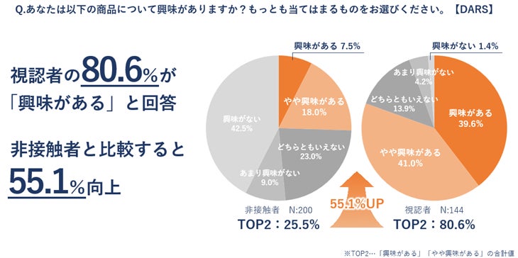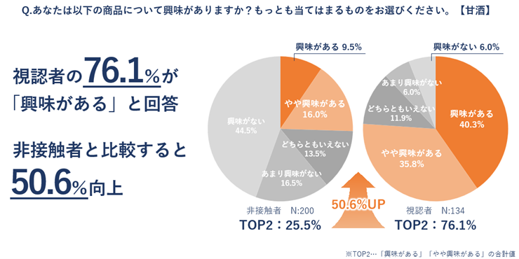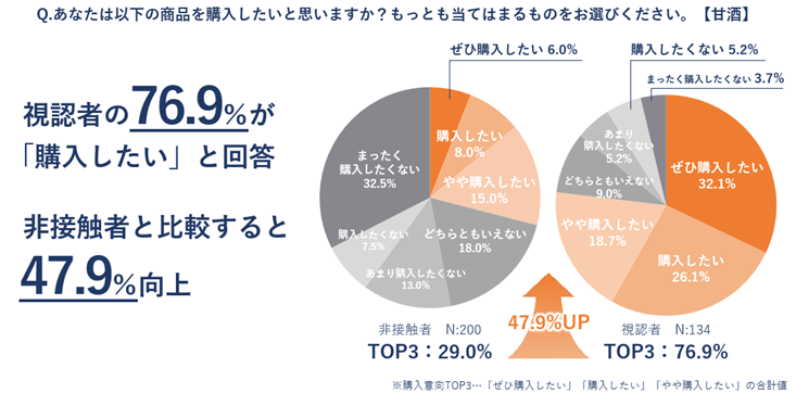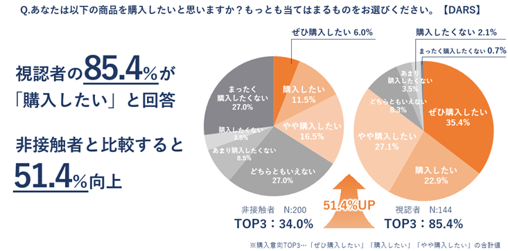 購入意向についても。興味関心と同様に「DARS」で85.4%、「甘酒」で76.9%のユーザーが「購入したい」と回答し、非接触者と比較すると約50%のリフト値を計測しました。生活に密接する商材であることと、ユーザーがお買い求めしやすい単価感であるということも購入意向に繋がっていると考えられます。