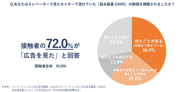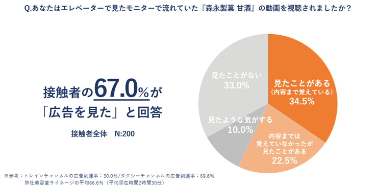 エレベーターという滞在時間が短い(平均15~20秒)環境にも関わらず約70%が該当のCMを見たと回答しました。CMerTVが展開している美容室サイネージ「BEAUTINISTA TV」(平均滞在時間150分で視認率平均が66.6%)と比較しても遜色ない結果が得られました。