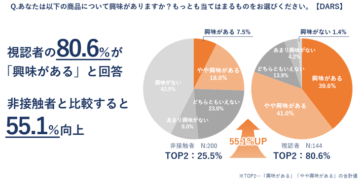 興味関心についても、「DARS」で80.6%、「甘酒」で76.1%のユーザーが「興味がある」と回答し、非接触者と比較すると50%以上のリフト値を計測しました。食品・飲料と住民に密接する商材とマンションというロケーションの相性の良さが上記結果に結びついていると考えられます。特に「DARS」については「甘酒」よりもターゲットが広いこともあり、80%を超えるユーザーの興味関心を得られたと推測できます。