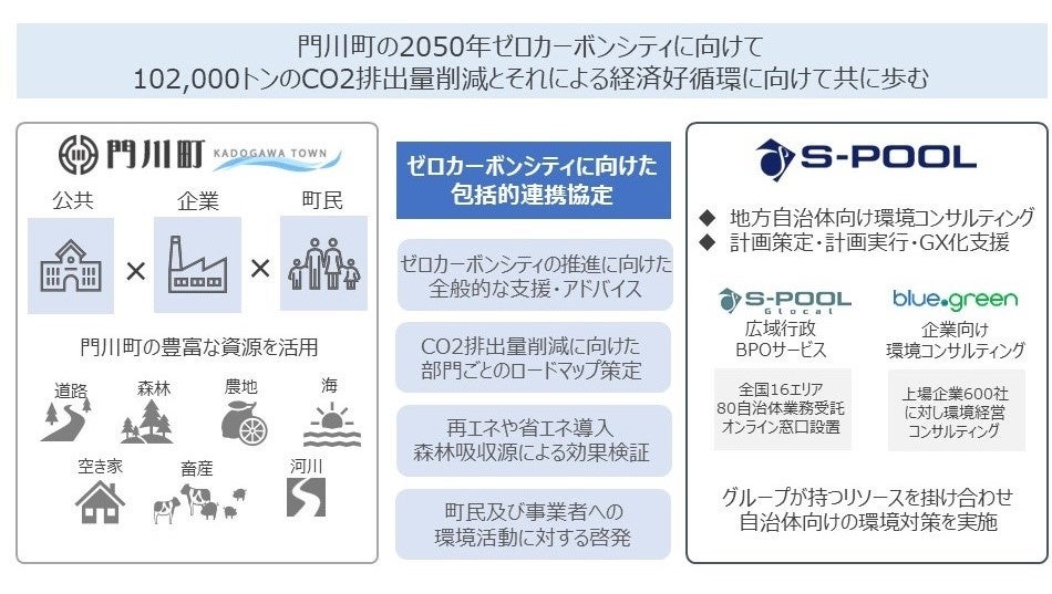 本提携は、門川町の持続可能なまちづくりを目的に、ゼロカーボンシティ実現に向けた推進計画策定および実行の支援を中長期的に行ってまいります。具体的には CO₂排出量等の算定や削減に向けたロードマップの策定、町民及び町内事業者への環境活動に対する普及活動等を行ってまいります。