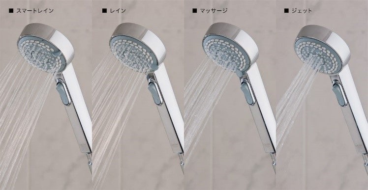 「スプリー90ハンドシャワー」は手元で止水・吐水の操作ができる一時止水機能付。水流の強弱や肌あたりの異なる4種類のシャワーパターンが楽しめます。素材にこだわった上質な空間に調和する、贅沢なアイテムです。
