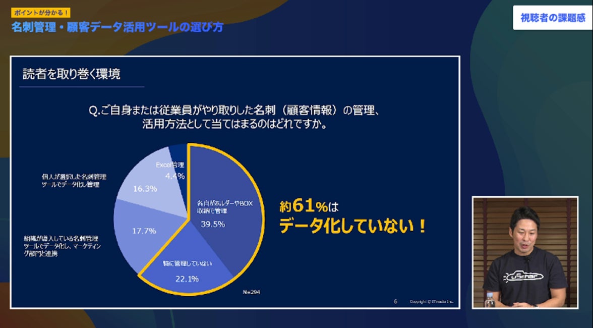 では、どのようなツールを選べばよいのか。自社に適した製品を選ぶポイントから活用術、セキュリティなど気をつけるべき点について、Sansan様と当社の湯浅が詳しく解説しています。