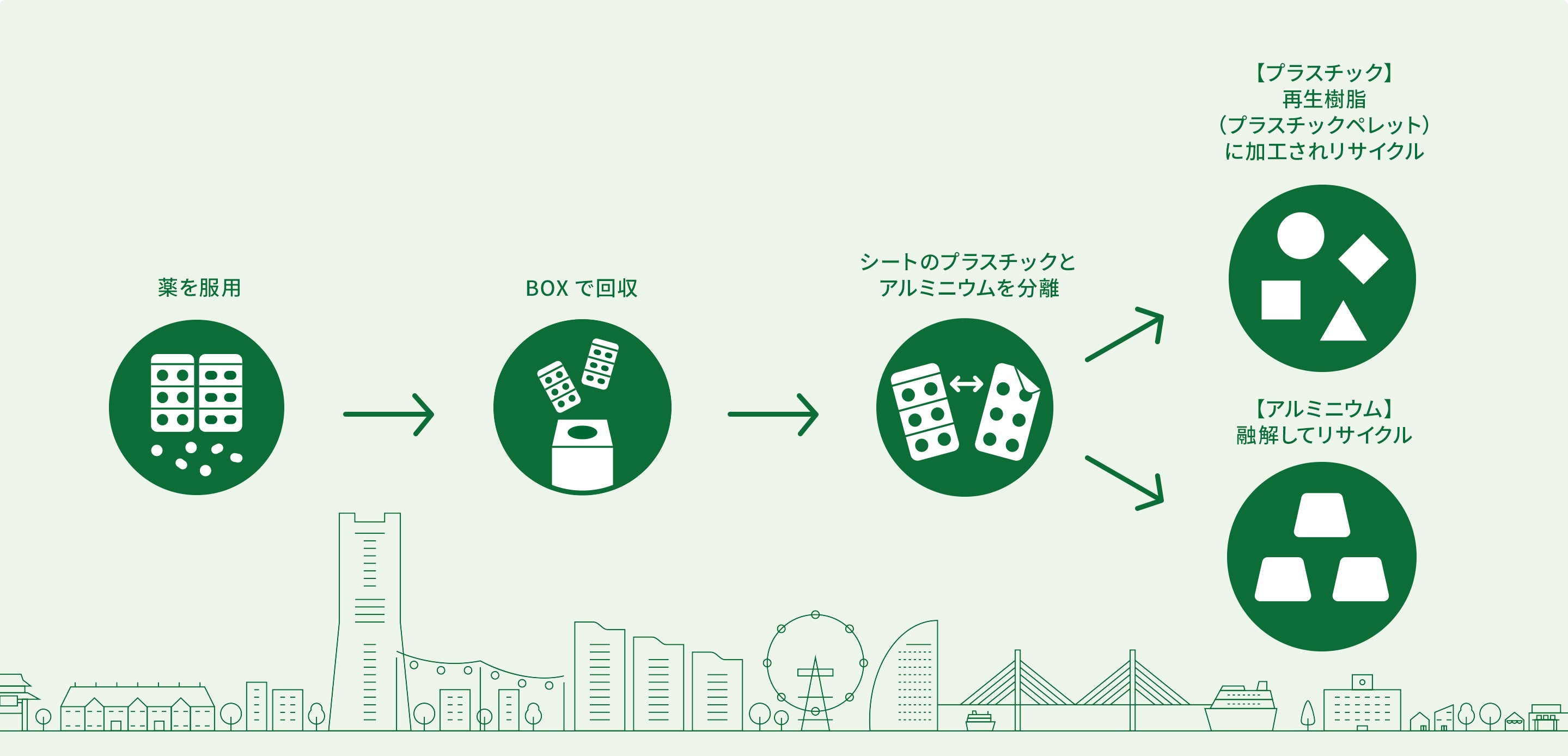 このたび「SDGs未来都市」として先導的な取り組みを行う横浜市において本プログラムを開始し、回収対象を当社の製品に限らず医療用医薬品・OTC医薬品の「おくすりシート」すべてとすることで、「おくすりシート」がリサイクル資源であることの認知を高め、資源として循環する仕組みを確立してまいります。