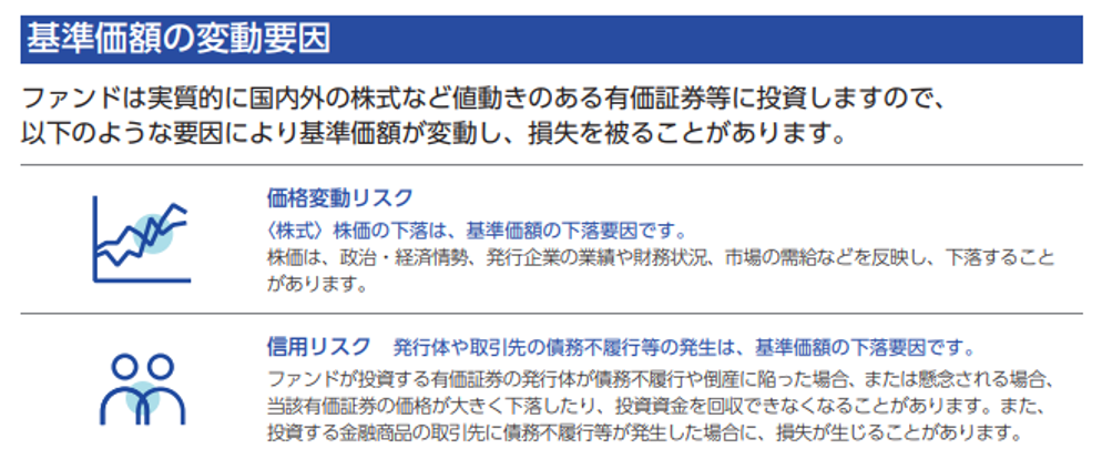 ファンドは実質的に国内外の株式など値動きのある有価証券等に投資しますので、価格変動リスク、信用リスク、カントリー・リスク、為替変動リスクなどにより基準価額が変動し、損失を被ることがあります。ファンドのお申し込みにあたっては、投資信託説明書(交付目論見書)をあらかじめまたは同時にお取扱金融機関にてお渡しいたしますので、必ず内容をご確認の上、ご自身でご判断ください。