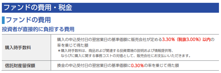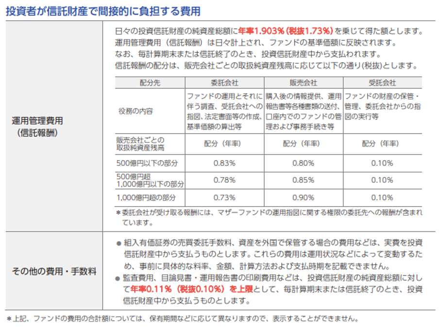 ■購入時手数料:上限3.30%(税込) ■信託財産留保額:0.30% ■運用管理費用(信託報酬):年率1.903%(税込) ■その他の費用・手数料:組入有価証券の売買委託手数料、資産を外国で保管する場合の費用、監査費用、目論見書・運用報告書の印刷費用など。当該ファンドの費用の合計額については、保有期間などに応じて異なりますので、表示することができません。