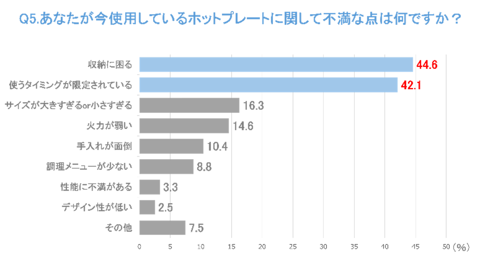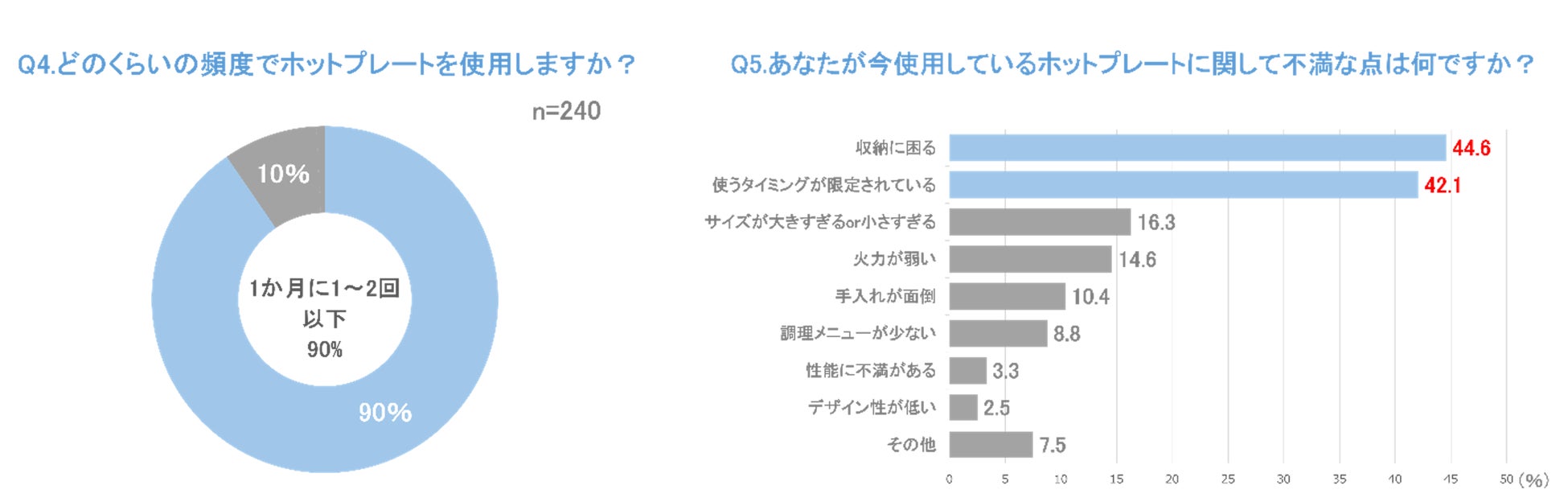 加えて、ホットプレートを持っている人に使用時の不満について尋ねると、約45%が「収納に困る」、約42%が「使うタイミングが限定されている」と回答し、用途が限定されるにも関わらずスペースを取るため、使用頻度が低くなることが伺えます(下図Q5参照)。特に3~4人用サイズの大きな製品は収納スペースの確保が難しく、利用者を悩ませているようです。