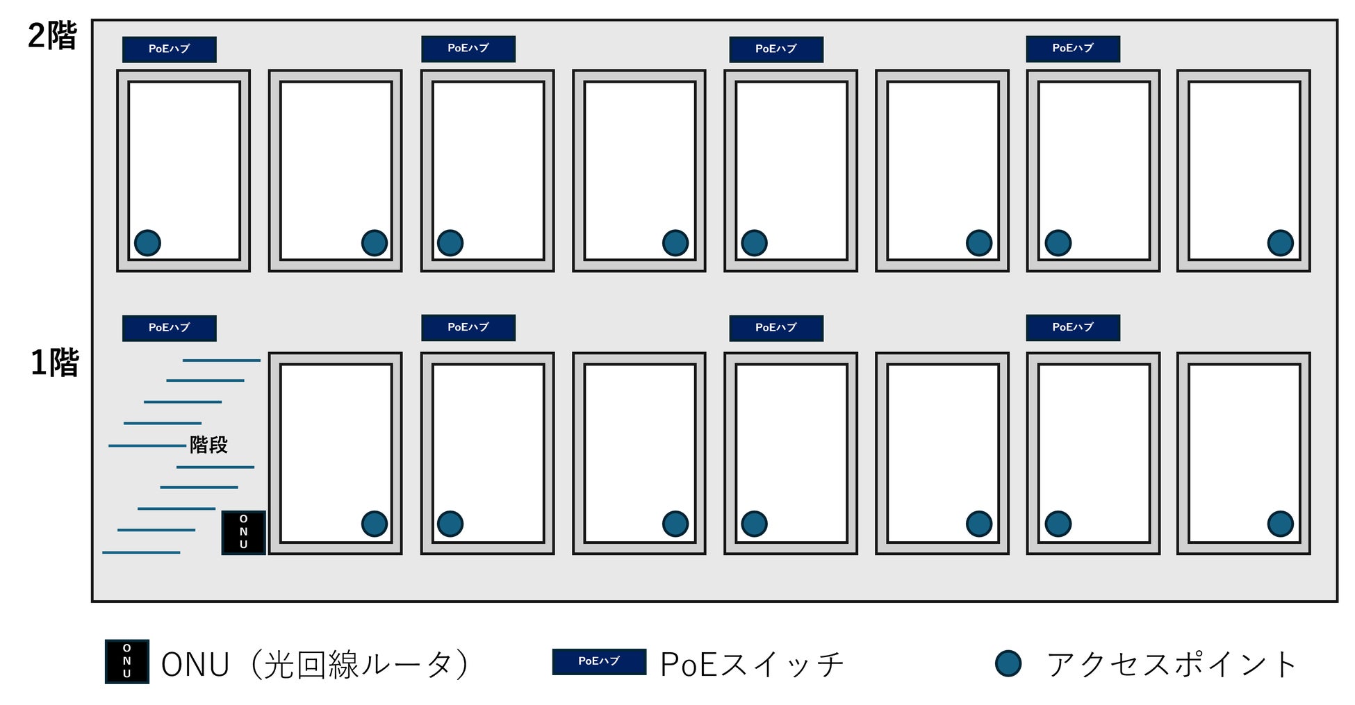 1階部分にONUを配置し光回線の引き込みを行います。天井裏にPoEスイッチを設置し、居室内に壁埋め込み型アクセスポイントを設置します。