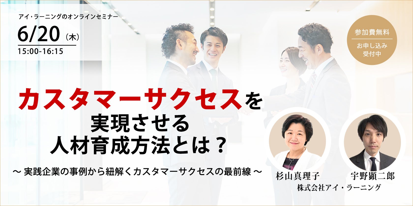 デジタル人材の育成をリードする株式会社アイ・ラーニング(本社:東京都中央区、社長:杉山 真理子)は、6月20日(木)に無料セミナー 『カスタマーサクセスを実現させる人材育成方法とは? ~実践企業の事例から紐解くカスタマーサクセスの最前線~』 をオンラインにて開催いたします。