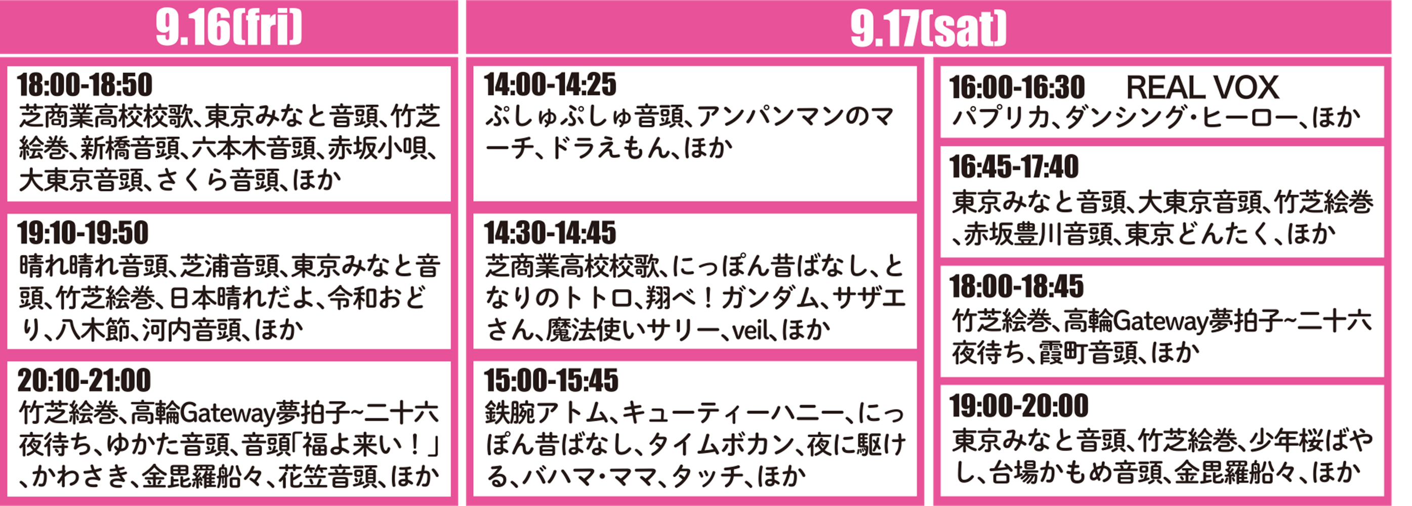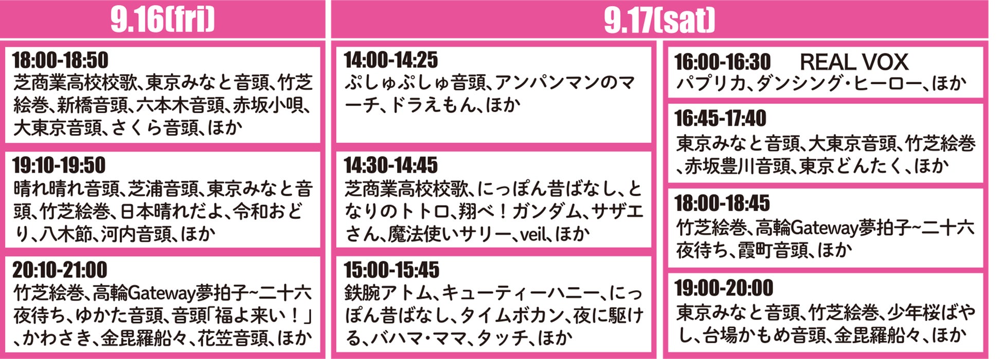 ドラえもん、サザエさんなど誰もが知っているアニソンから夜に駆ける、うっせぇわなど人気のポップス、また伝統的な芝浦音頭、赤坂小唄など、老若男女が楽しめるイベントです。