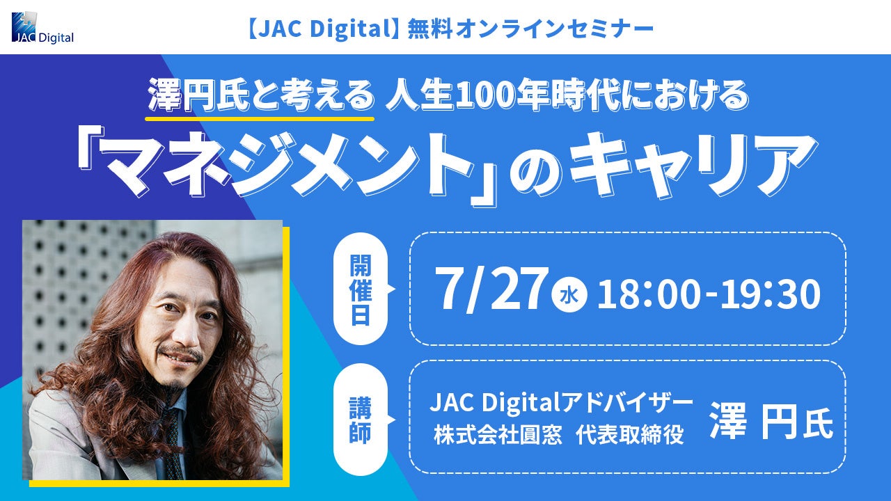 世界11ヵ国で人材紹介事業を展開する業界大手の株式会社 ジェイ エイ シー リクルートメント(代表取締役会長兼社長:田崎 ひろみ、本社:東京都千代田区)は、澤円氏と考える 人生100年時代における「マネジメント」のキャリアと題したオンラインセミナーを7/27(水)に開催いたします。