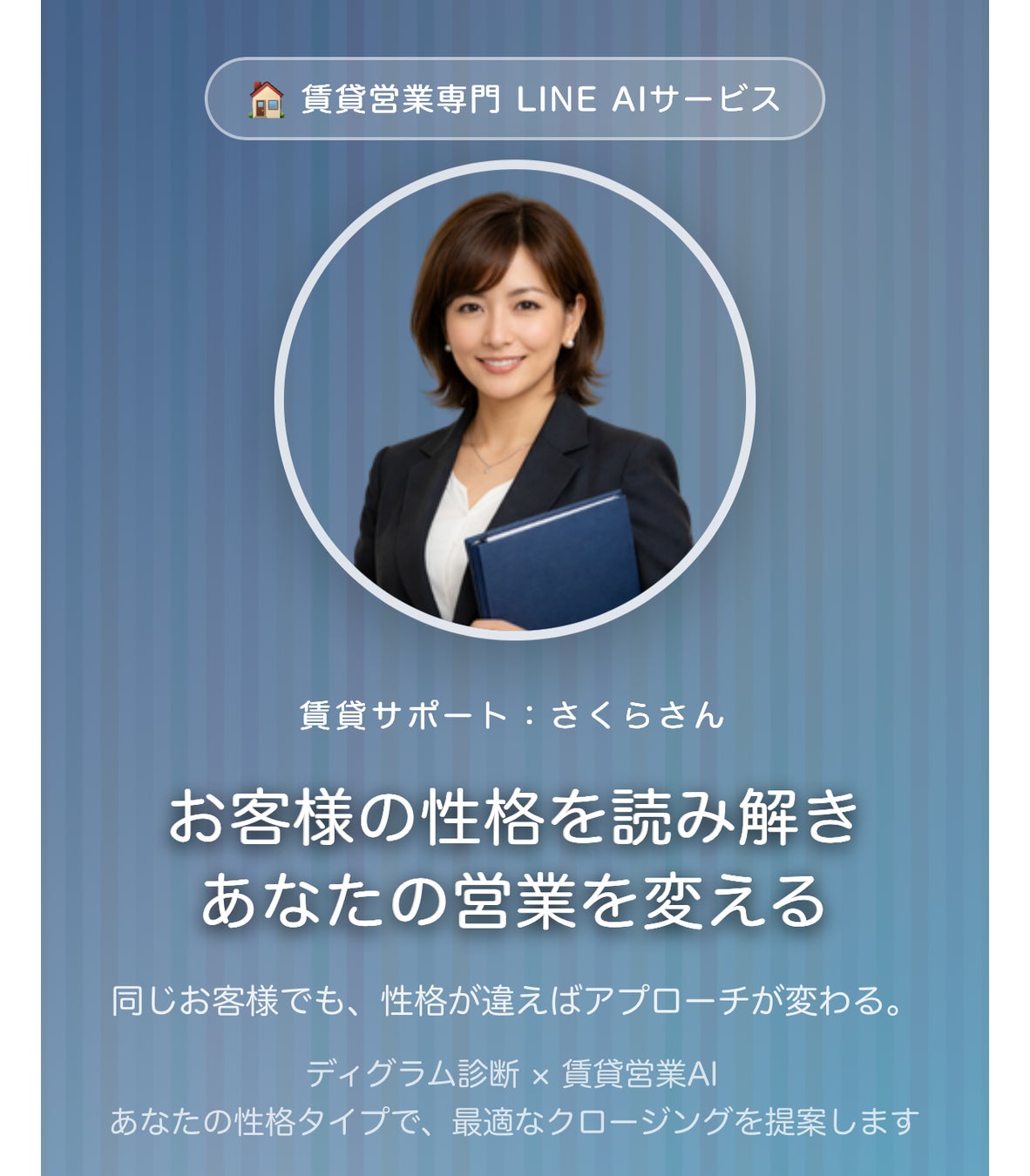 すでにその第一弾として、不動産業界向けの「不動産営業サポートAI」(LINE版)の販売を開始しています。物件探し・住み替え・資金計画・お客様の性格に合わせた営業アプローチなど、不動産のプロが持つ知識とディグラム診断AIを組み合わせ、営業の現場を支援するサービスです。