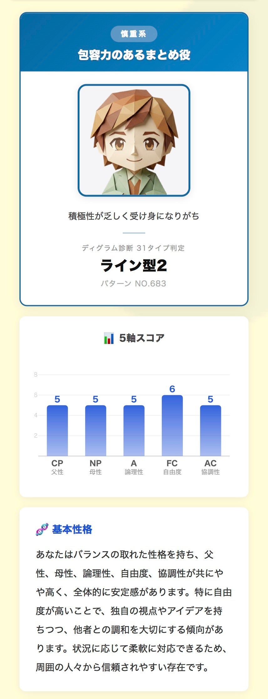 通常版が「どのタイプか」を判定するのに対し、ADVANCEDは5軸それぞれのスコア数値まで算出します。たとえば同じ31タイプに属する人でも、「父性が高めで自由度が低め」「母性が突出して協調性も高い」など、数値の組み合わせによって個性の出方は大きく異なります。この5軸スコアを組み合わせることで、1,024通りの詳細解説が初めて可能になります。