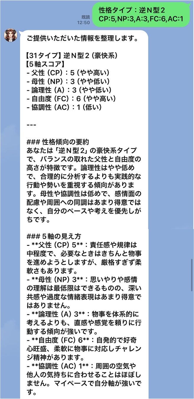 ADVANCEDで取得した5軸スコアを「ディグラム姐さん」に共有すると、AIはタイプ名だけでなく各軸の数値バランスまで読み取り、より精度の高いアドバイスを返します。同じ「協調性が高い」タイプでも、論理性の高さや自由度の低さによって、職場での摩擦が起きやすいポイントや、ストレスへの反応パターンはまったく異なります。ADVANCEDのスコアがあることで、AIはその「細かい個性」まで踏み込んだ解説ができます。