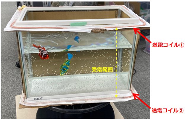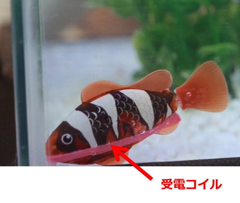 水槽上下にワイヤレス給電用のコイルが内蔵されており、水槽全体が給電空間になっています。空間内にある限りは、お魚ロボットはワイヤレスで電力を受ける事が可能な為、バッテリーレスで動き続ける事が可能です。。