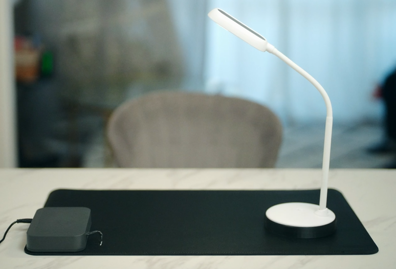 黒いマット部がワイヤレス給電の送電エリアになっており、ライトに内蔵された受電モジュールへワイヤレス電力伝送を行い点灯させます。マット上であれば、配線レスでライトへの給電が可能です。