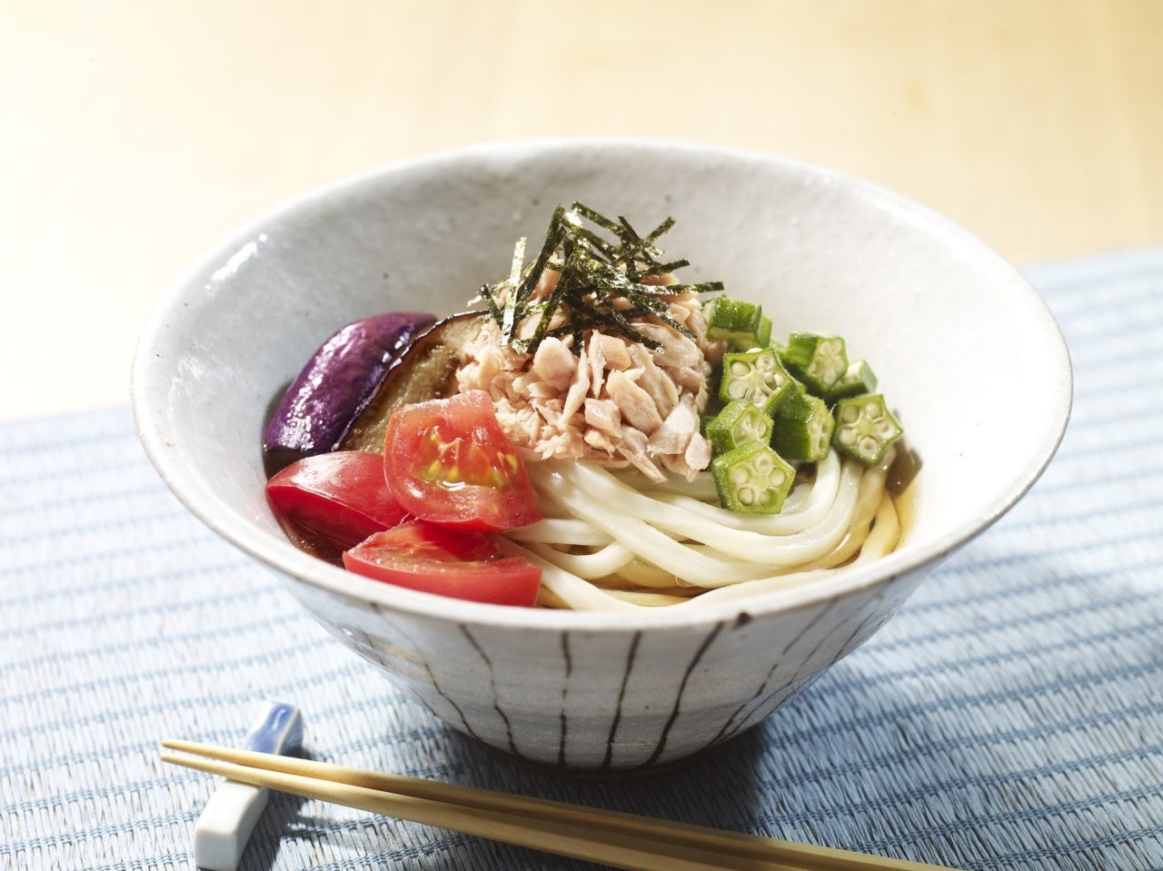 ① うどんはゆでて水洗いをし、水けをきって器に盛ります。