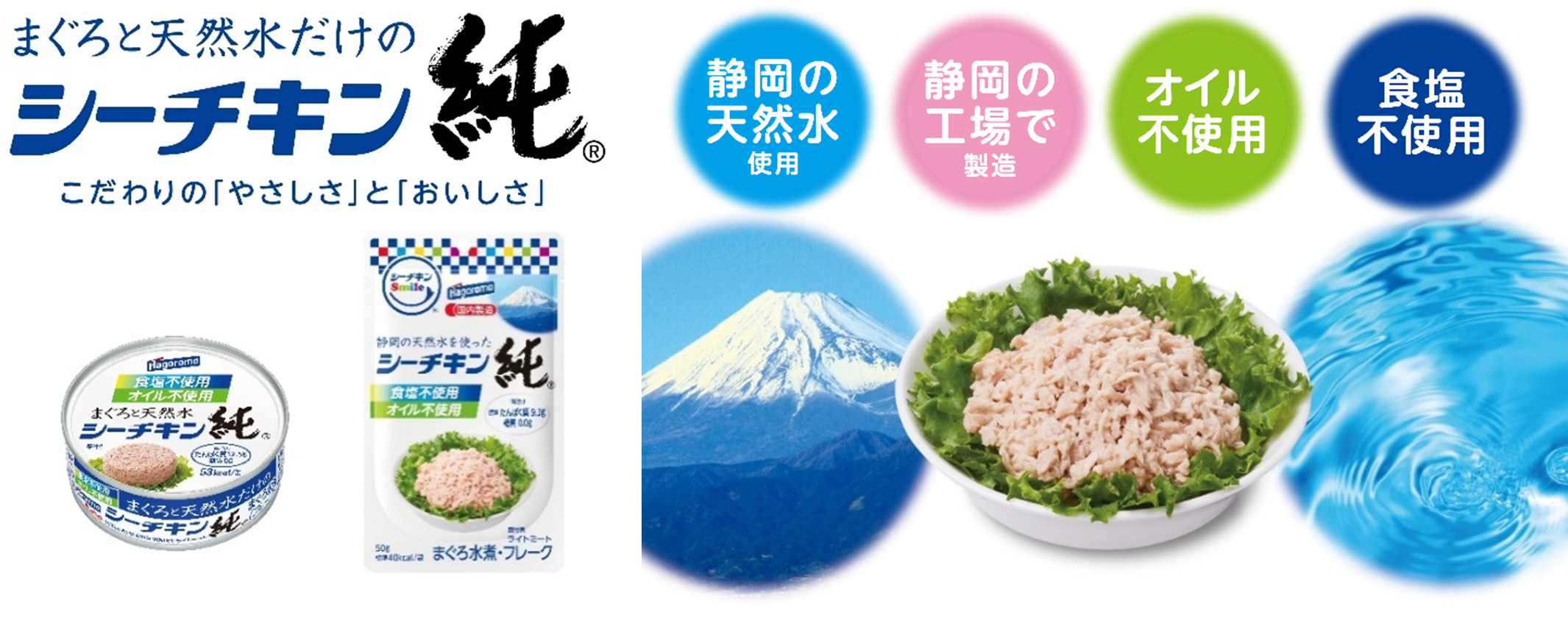 『シーチキン純』シリーズは、食塩・オイル不使用で、原材料はまぐろと天然水だけのシーチキンです。シリーズを通して、低塩分のきはだまぐろと静岡県の天然水のみを使用し、国内の工場で製造しています。