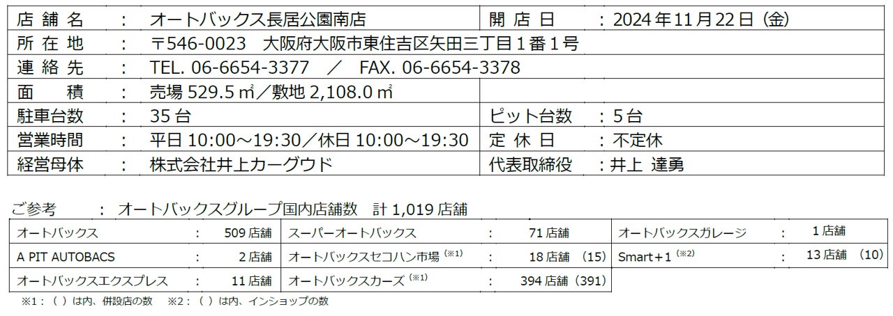 株式会社オートバックスセブン(代表取締役 社長:堀井勇吾)と加盟店契約を結んでいる株式会社井上カーグウド(代表取締役:井上達勇)は、2024年11月22日(金)に「オートバックス長居公園南店」を新規オープンいたします。