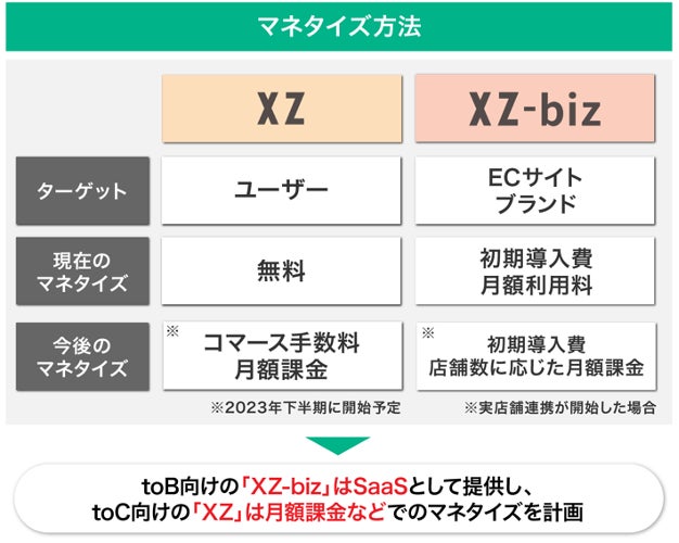 一方「XZ-biz」は、初期導入費と月額利用料のSaaSとして提供していきます。ECサイト向けには、シミュレーション(タップ)数に応じて金額が決まる形態ですが、「XZ-biz」の実店舗向けサービスが開始した際は、ブランドごとの初期費用+導入店舗数に応じた月額料金とする予定です。