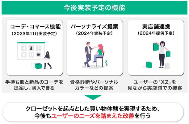 今後は、コーデ・コマースや実店舗対応など多くの機能追加を予定しています。また、クロスブランドやアプリ連携でクローゼットを統合し、最適なファッション体験を提供することで企業として成長してまいります。
