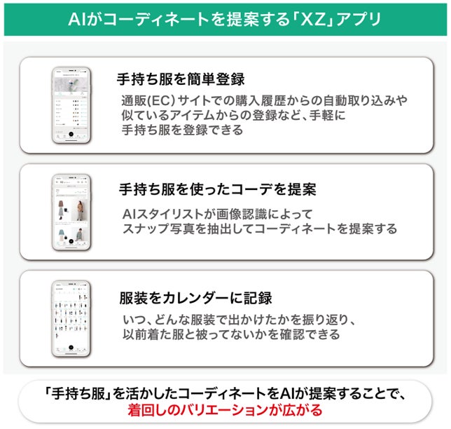 株式会社STANDING OVATIONのアプリ「XZ」は、AIスタイリストがユーザーの手持ち服を組み合わせて実現できる着回しのコーディネートを自動で提案してくれるアプリです。手持ち服を登録してデータ化し、AIが画像認識によって手持ち服と同じ属性(色やカテゴリー)の服で構成されたスナップ写真を抽出してマッチングします。スナップ写真は、主要なアパレルブランドやファッション系インスタグラマーと連携し、許諾を得た上で提供しています。手持ち服と同じ属性の服を組み合わせたプロの着こなしを見ることでイメージが湧き、コーディネートを決める参考にすることができます。