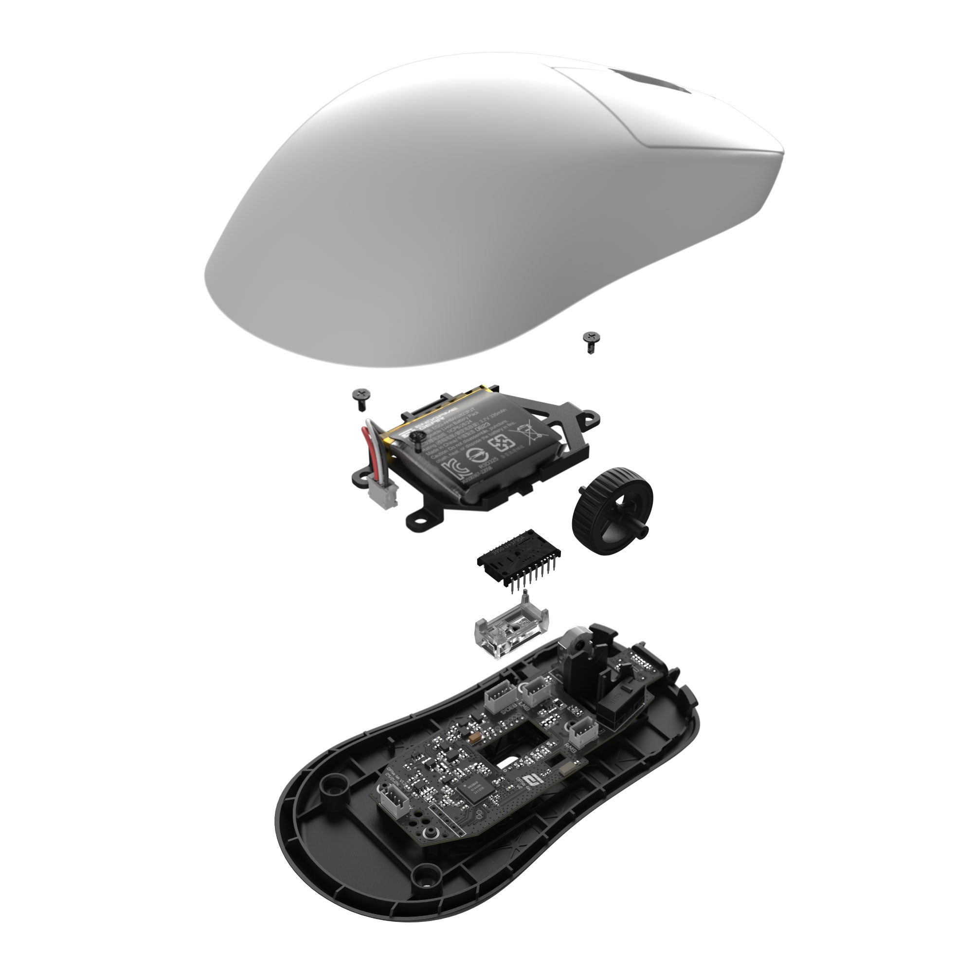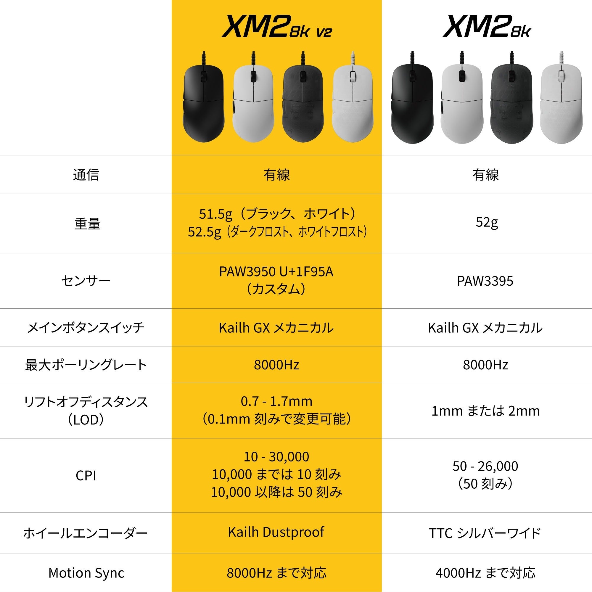 新モデルではセンサーのアップグレードとそれに伴うソフトウェアの機能向上、ホイールエンコーダーの改善、ケーブルの改良(ワイヤレスモデルのみ)を実施しました。マウス形状やスイッチ、2種類のスケートセットなど、その他ハードウェア仕様はv1と同一です。