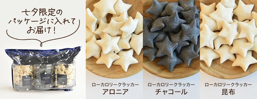 七夕に合わせて特別にご用意したキラキラした星がアクセントになったパッケージに、星型のおやつ3種類(「アロニア」「チャコール」「昆布」のローカロリークラッカー)を詰め合わせました。クラッカーは、生地に寒天を加えることでカロリーを抑えた繊維質豊富なおやつで、ひと粒あたり1.3~1.5kcal。ダイエット中でもおすすめです。(数量限定品のため、リリース時に完売している場合があります。ご注意ください。)