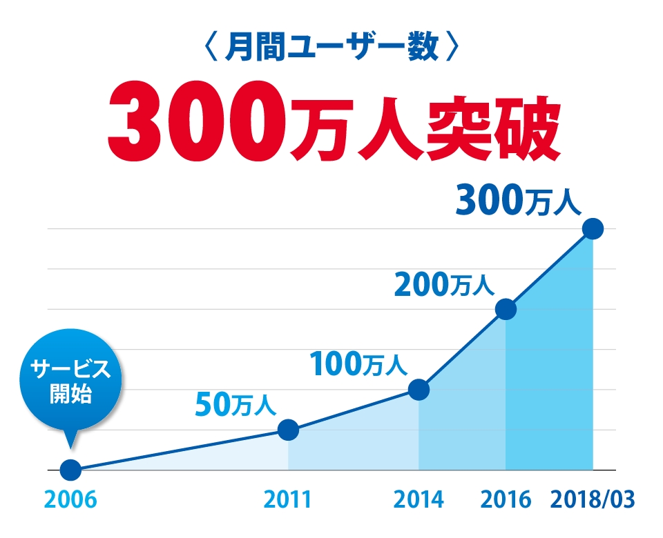 2006年にサービスを開始してから、2014年7月に月間ユーザー数100万人を突破、そこから約26カ月後に200万人を達成しました。今回の300万人突破はさらに短い約18カ月で達成できました。今後もさらなるスピード成長を目指します。