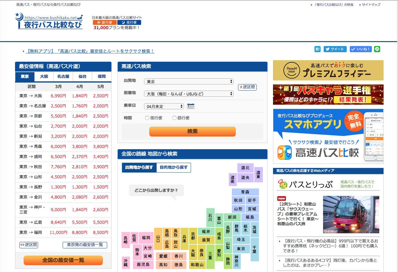 「夜行バス比較なび」(https://www.bushikaku.net/)は全国約170のバス会社・約31,000プランの中から出発地・目的地・日付・時間帯を指定し料金比較できる国内最大級の高速バス・夜行バス比較サイトです。