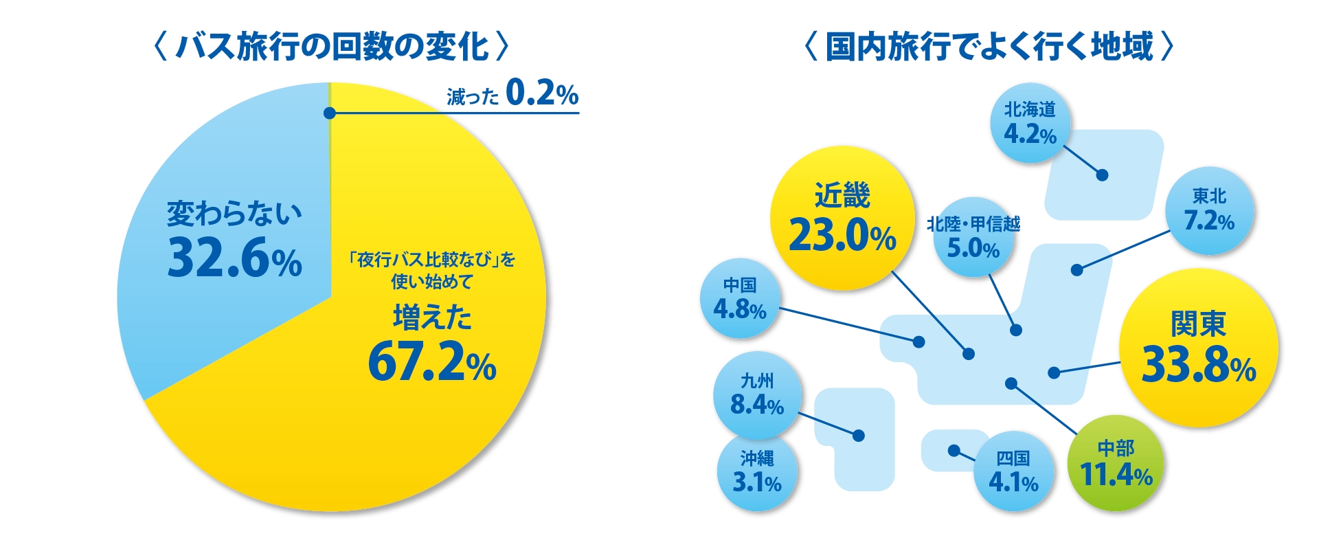 20〜30代前半の女性ユーザーが中心となっております。国内でよく行く地域として「関東」「近畿」「中部」が上位に挙げられています。「夜行バス比較なび」は主にバス旅行好きの女性に支持されるサイトとして今後もサービス・機能を改善してまいります。