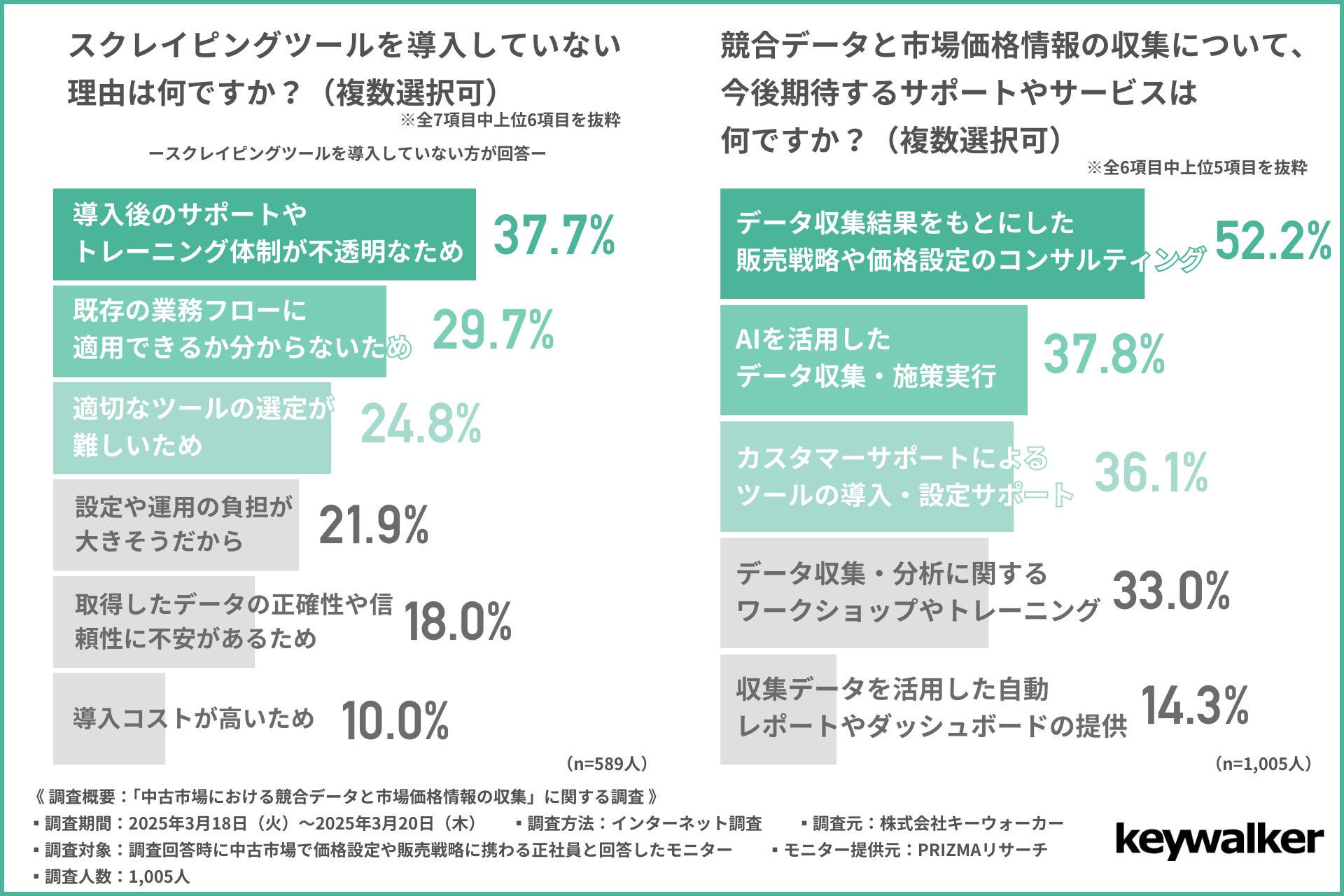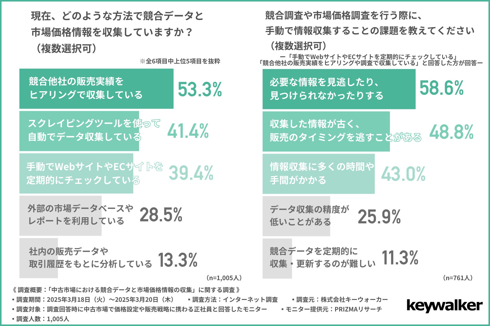 株式会社キーウォーカー(所在地:東京都港区、代表取締役社長:小林 一登)は、中古市場で価格設定や販売戦略に携わる正社員を対象に、「中古市場における競合データと市場価格情報の収集」に関する調査を実施しました。