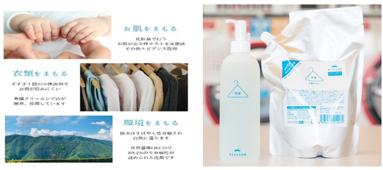『海をまもる洗剤』は、世界基準(OECD)で、89.2%の生分解性が認められることから、 排水は自然に還ります。衣類や靴の洗濯だけでなく、キッチンの汚れなど掃除にも利用でき ることから、1 種類の洗剤ですみ、ボトルは再利用できるのでプラごみ削減につながります。 当社はこれからも、『海をまもる洗剤』の量り売りサービスを提供する店舗を増やすことで、 海を守るソーシャルアクションに寄与し、クリーニングを通じた持続可能な社会の実現に貢献します。