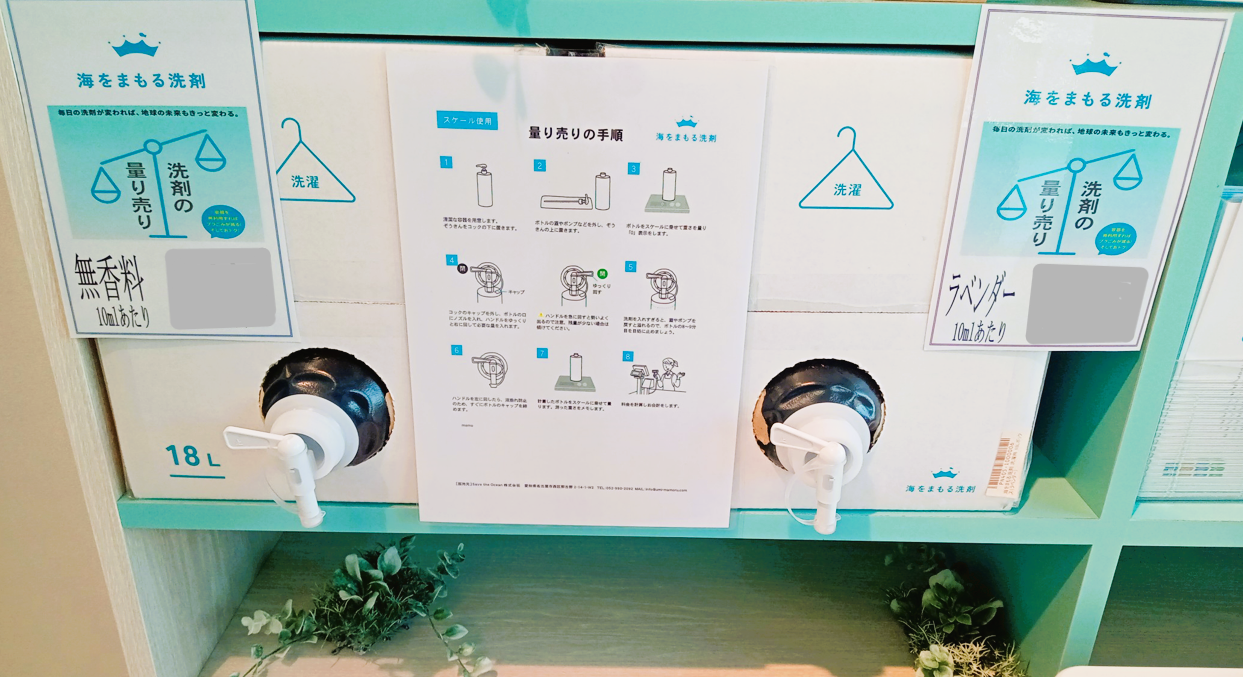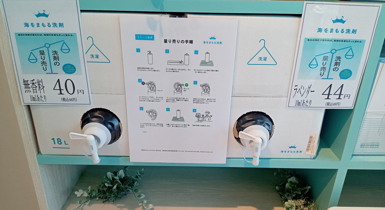 専用のプラスチック容器をご購入していただき、容器に必要な分だけ洗剤を入れて、ご購入いただけます。そして、その容器は今後もご利用いただけます。