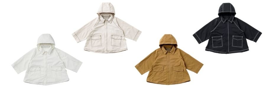 袖丈は2段階で調節ができ、20cmの成長に対応。 取り外せるフードや、風の侵入を防ぐ裾のゴムなど、気候に合わせて長く着こなせます。