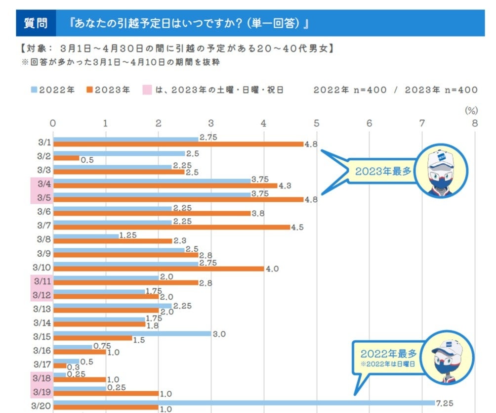 日別でみると昨年(2022年)のアンケート調査では3月20日を予定する人が最多でしたが、これは3連休の2日目であったことも影響したと考えられます。今年の調査時点では、3月1日(水)と3月5日(日)に引越予定と回答した人が最も多い結果でした。また混みあう週末を避け平日に予定を選択するなどの傾向もみられます。
