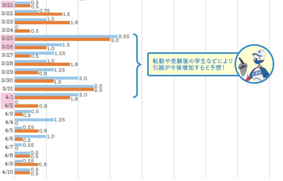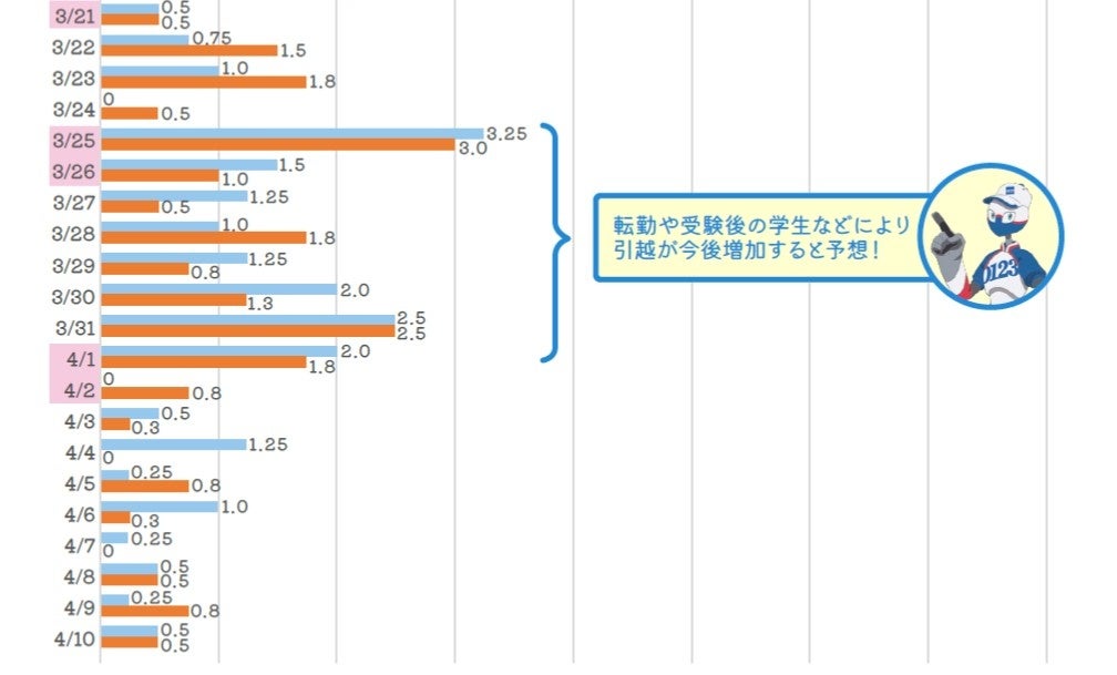 調査は2月上旬時点のもののため、今後、人事異動に伴う転勤の引越や受験後の学生の駆け込み引越も発生することから、3月下旬から4月上旬にかけては混雑することが予想されます。