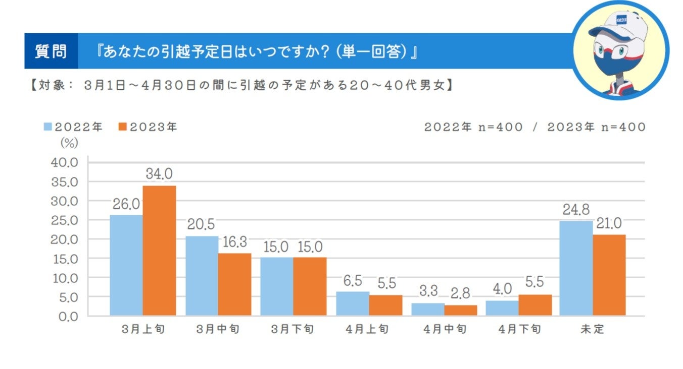 また、2月上旬時点で3月と4月の引越を予定しているが詳しい日程を「未定」としている人も、昨年の同調査よりも今年の調査の方が、3.8ポイント低い回答で早めに引越を準備している人が増えていることがわかります。