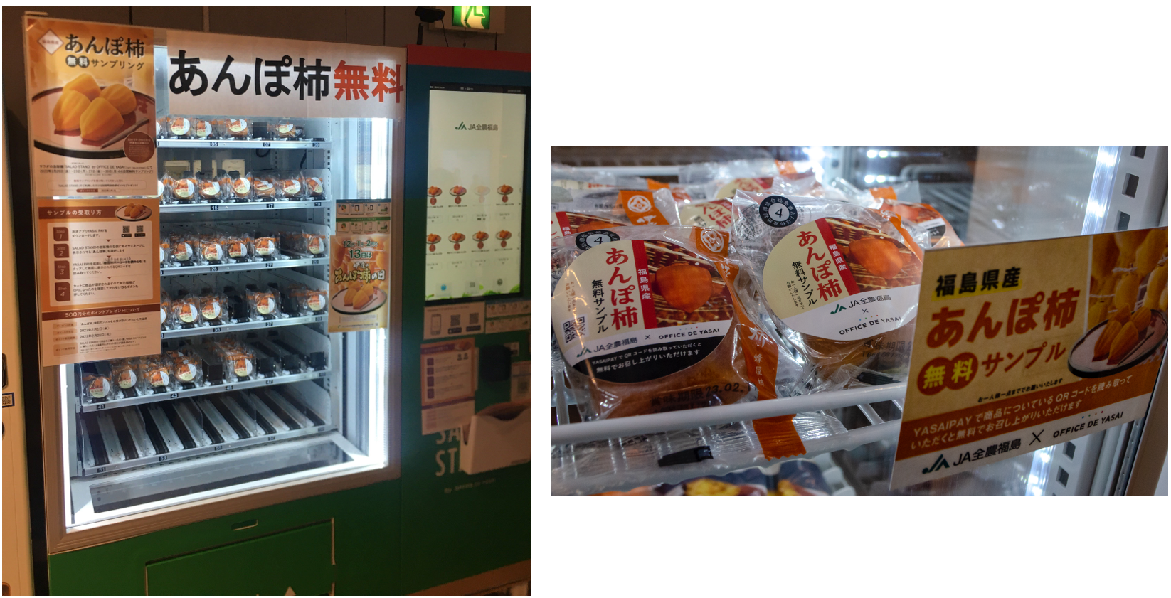 今回は福島県産「あんぽ柿」を実食いただく機会を作るため、その場で簡単に食べられるよう個包装にし、オフィスに設置した冷蔵庫とサラダの自販機「SALAD STAND」にてサンプリングを実施いたしました。